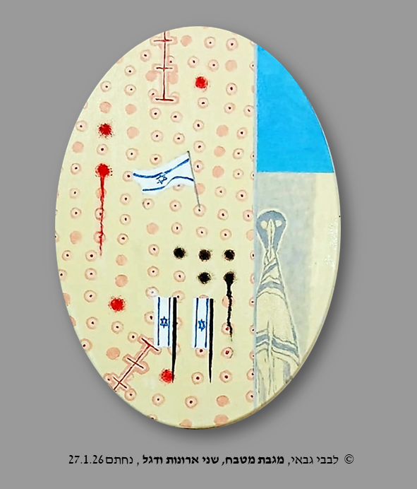 לבבי גבאי, מראה ודגלים, 2025 לבבי גבאי, מגבת ומראה בחדר האמבטיה, 2025 לבבי גבאי, ארונות בשדרה, 2025 מגבת מטבח שני ארונות ודגל 27.1.26 קאי התינוק על אדן החלון 7.10.23 , 2026 לבבי גבאי, פה, 2010/2026 שמן על בד 80X90 לבבי גבאי, מראה מדממת באמבטיה 23.6.25 « הקודם